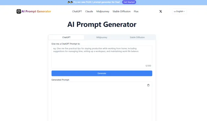 AI Prompt Generator is a powerful tool designed to enhance creativity and productivity in the artificial intelligence industry. By leveraging advanced algorithms and natural language processing, this tool helps users generate effective prompts for various AI models, including ChatGPT, Claude, Midjourney, and Stable Diffusion.