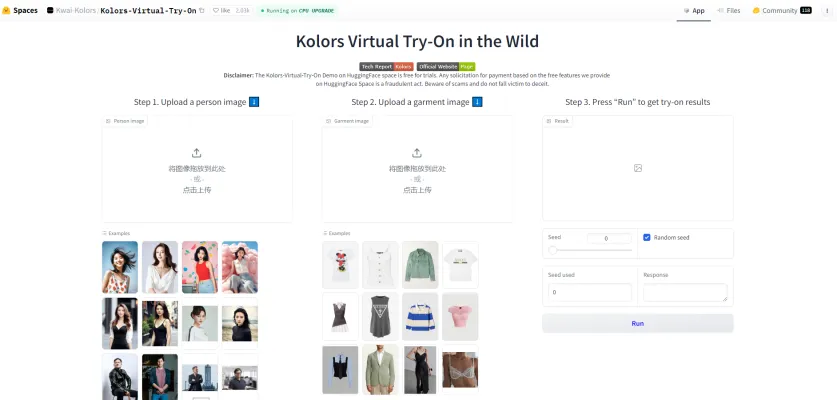 Kolors Virtual Try-On is an innovative AI-powered application developed by the Kwai-Kolors team, hosted on Hugging Face. This platform leverages advanced machine learning techniques to allow users to virtually try on clothing and accessories, enabling a realistic and interactive shopping experience from the comfort of their homes.