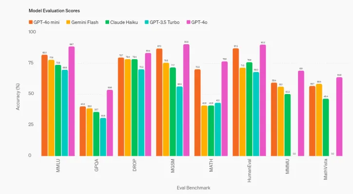 Despite its smaller size, GPT-4o mini does not compromise on performance. It outperforms the GPT-4 model in chat preferences and scores an impressive 82% on the Massive Multitask Language Understanding (MMLU) benchmark, which evaluates a model's ability to understand and use language across various domains. This score surpasses other models such as Google's Gemini Flash and Anthropic's Claude Haiku, making GPT-4o mini a leader in textual intelligence and multimodal reasoning.