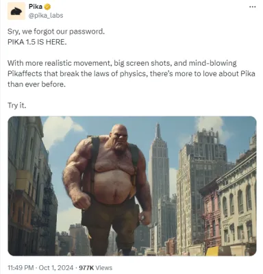 (Pika 1.5 Official Twitter Update Post: https://x.com/pika_labs/status/1841143349576941863)