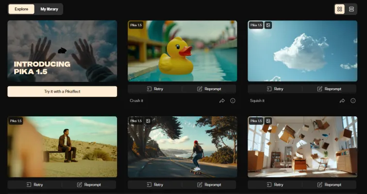 Pika 1.5 simplifies the video creation process through an intuitive interface that guides users in generating high-quality content with minimal technical knowledge. Users input their desired prompts or select effects, and the AI handles the rendering and editing processes automatically.