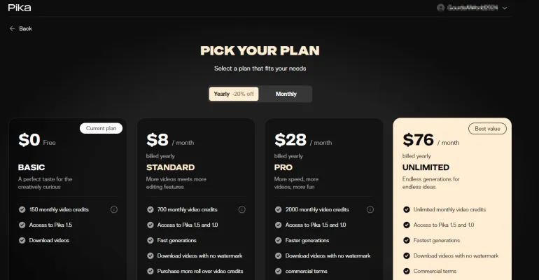 The pricing for Pika 1.5 includes a free tier providing 150 credits monthly, while paid subscriptions start at $8 per month, offering 700 credits and additional features tailored for various user needs. For more subscription options and detailed pricing information, please visit the Pika AI official website.