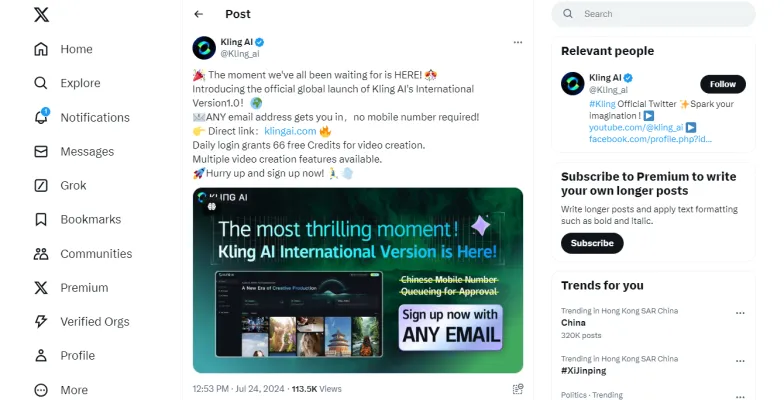 According to Kling AI's official Twitter, the International Version 1.0 eliminates the need for a Chinese phone number. Regardless of your location, you can now use your email address to access this AI video generator immediately!