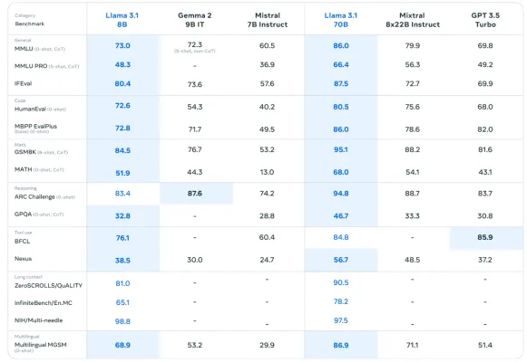 Llama 3.1 excels in tool use and reasoning, making it suitable for sophisticated AI applications. It can integrate with various tools and APIs, enabling it to perform complex tasks such as data analysis and code generation.