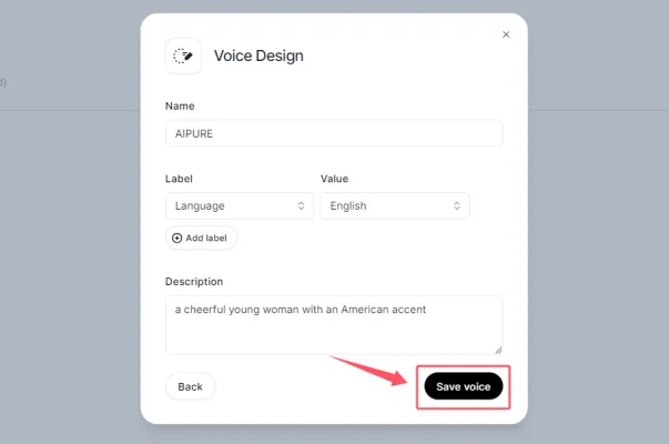 - Enter the name, label, value, and description for the generated voice, then click "Save Voice."