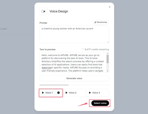 - Review the generated options—up to three different voices will be produced based on your prompt.