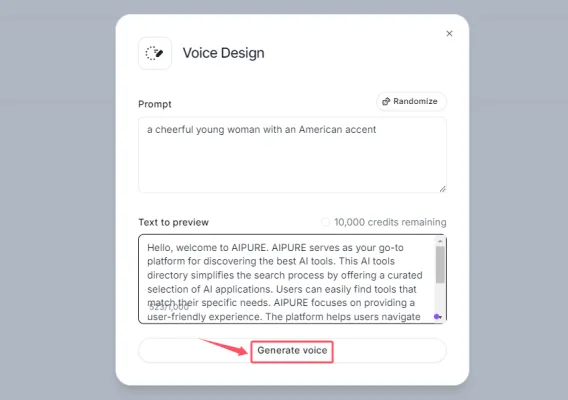 - Enter a detailed description of the voice you want to create (e.g., "a cheerful young woman with an American accent").