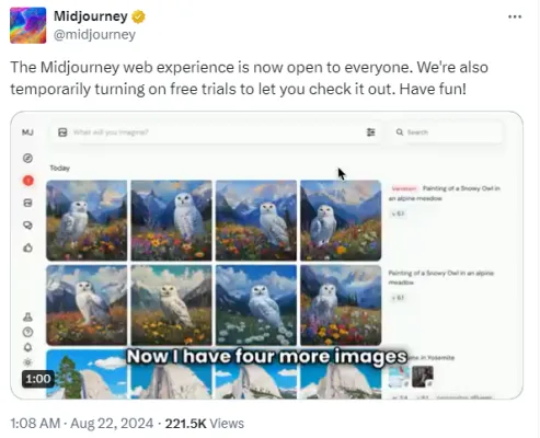 Are you eager to try Midjourney for free but hesitant to use Discord? Good news: On August 22, 2024(Today), Midjourney's Twitter officially announced that their web platform is now open to the public with a temporary free trial. You can now create up to 25 images online without any cost!
