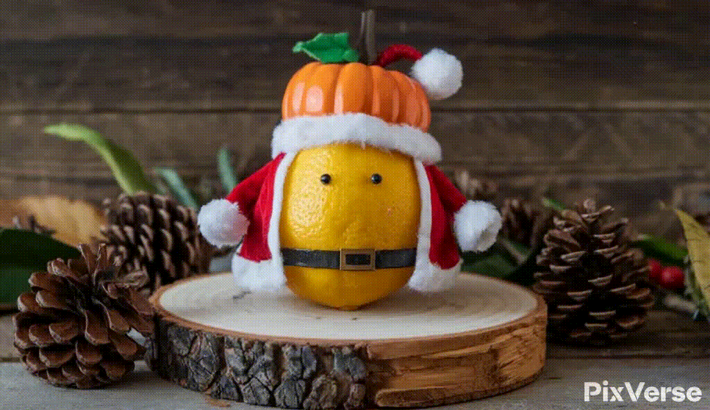 Prompt: A lemon dressed in Santa Claus's clothes and a pumpkin hat grew legs and ran away