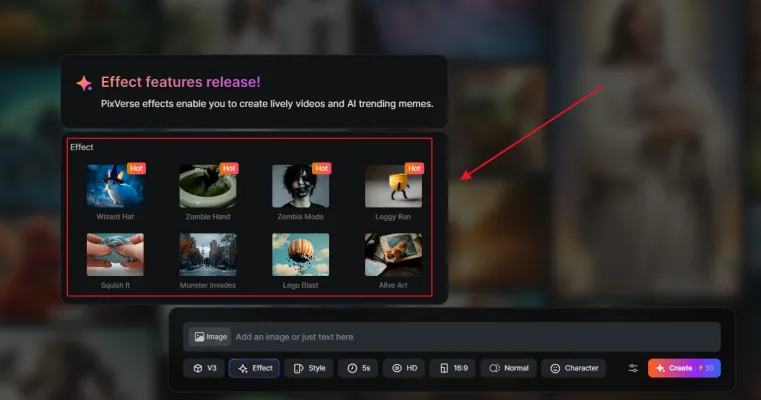 3. Effect: Delve into a set of eight new creative effects including the recently updated explosion effect from Pika AI, designed to spark your imagination. Particularly intriguing are the Halloween-themed effects such as Zombie Mode, Wizard Hat, and Monster Invasion.