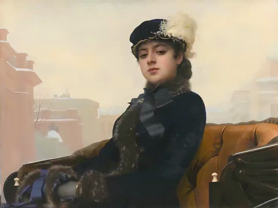 (Prompt for first 5s: Static shot, the woman in the painting smiles wickedly as she pulls out a machine gun from below and starts firing at the camera, the muzzle flaring with fire.