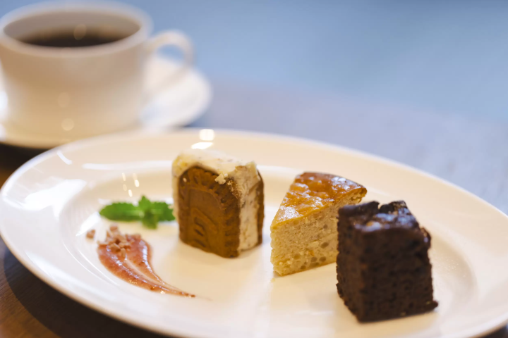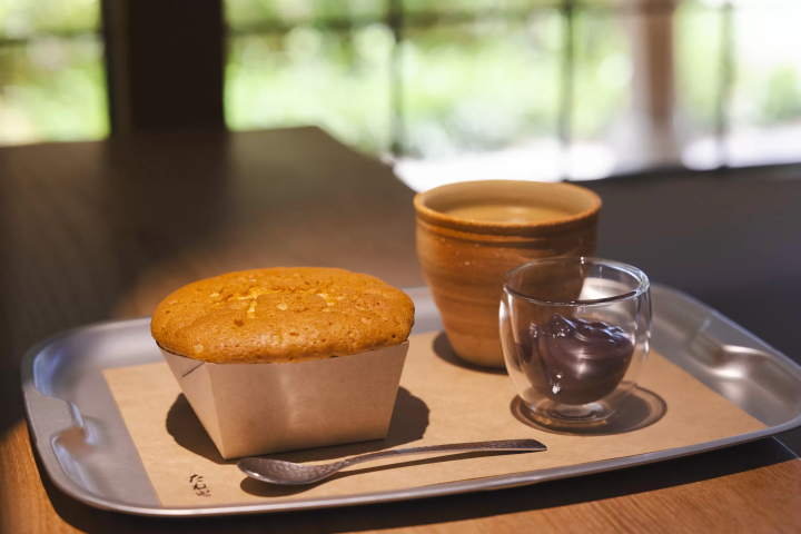 敷地内のカフェでは、できたてのスイーツを味わえます。特におすすめはカステラカフェの「焼きたてたねやカステラセット」。焼きたてならではのふわふわの食感と、卵の豊かな風味を存分に楽しめます。