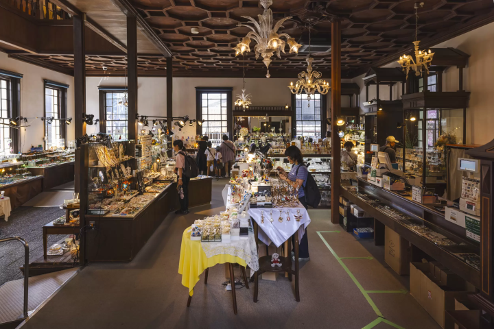 市街地の中心商店街には、地元の工芸品やグルメを楽しめるスポットが揃っています。中でも必見なのが「黒壁スクエア」。その中にある「黒壁ガラス館」は旧銀行の建物を利用したガラス工芸品を取り扱う名所で、日本の職人が手がけた美しい作品から、世界各地の有名なガラス工芸の逸品まで幅広く鑑賞、購入することができます。