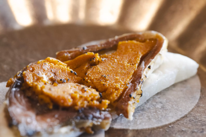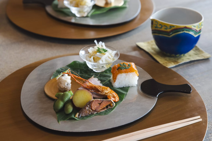 料理を通じて、鮒ずしの魅力をさまざまな形で体験できます。前菜には鮒の子付(身に卵をまぶした料理)が登場し、その後の料理では本格的な鮒ずしを味わうことができ、さらに琵琶マスを使った小袖ずしと一皿で様々な料理を味わうことができます。発酵した米から生まれる鮒ずし特有の鋭い酸味は、日本酒や酒粕を思わせる風味で、多くの人にとって驚きの体験となるでしょう。