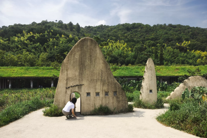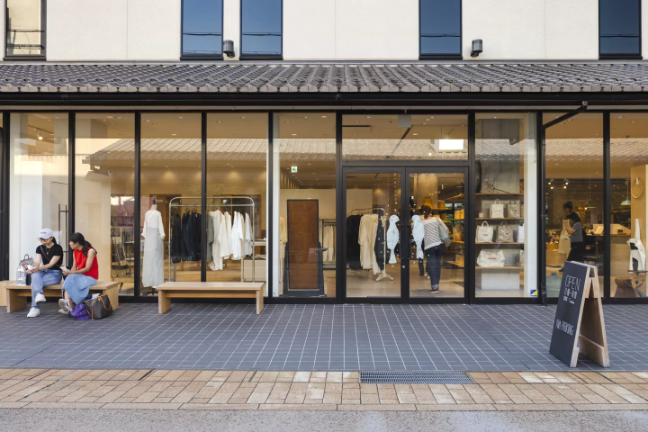 店舗のコンセプトは「自然に学ぶ」。芝生で覆われた特徴的な屋根のメインショップは、周囲の田んぼや背後の山と見事に調和しており、自然と一体になった景観を楽しめます。