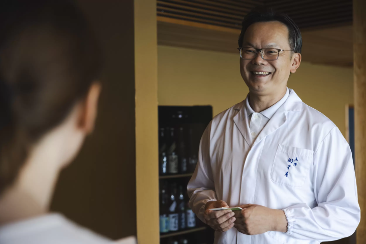 湖里庵を切り盛りするのは、店主で料理長の左嵜謙祐さん。代々、海津で鮒ずし専門店「魚治」を営んできた家に生まれ、その伝統を引き継ぎながら、洗練された料理で鮒ずし文化を広めています。
