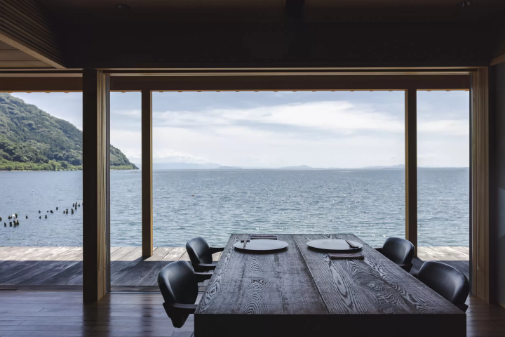 店内に足を踏み入れると、まず目に飛び込んでくるのは大きな窓から広がる琵琶湖の絶景です。食事処と湖のあいだにはわずかな縁側があるだけで、まるで水面の上で食事をしているような感覚になります。この空間を設計したのは、料理長の弟さんです。