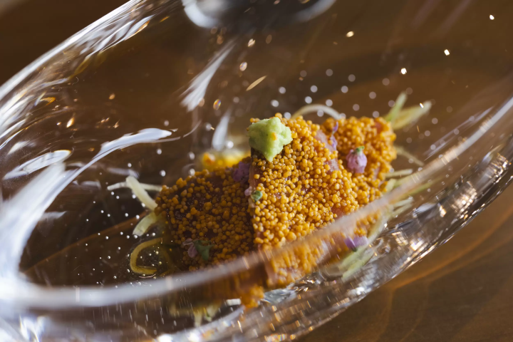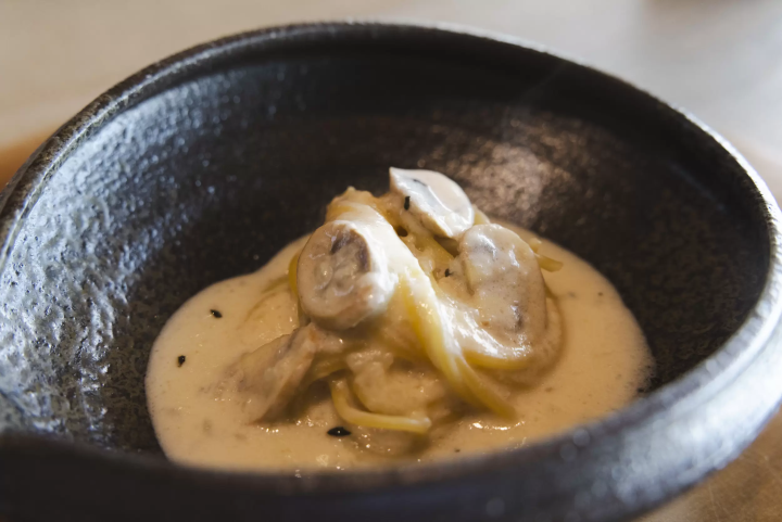 そのほかの料理では、シェフの独創性と技が光ります。チーズのように見えるクリーミーなソースをまとったパスタは、実は鮒ずしを使ったもの。穏やかで優しい味わいが、鮒ずしの新しい一面を感じさせてくれます。