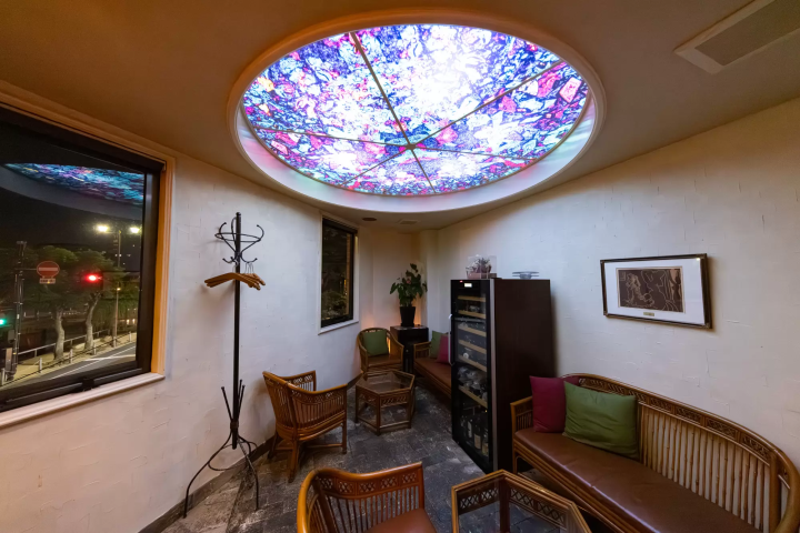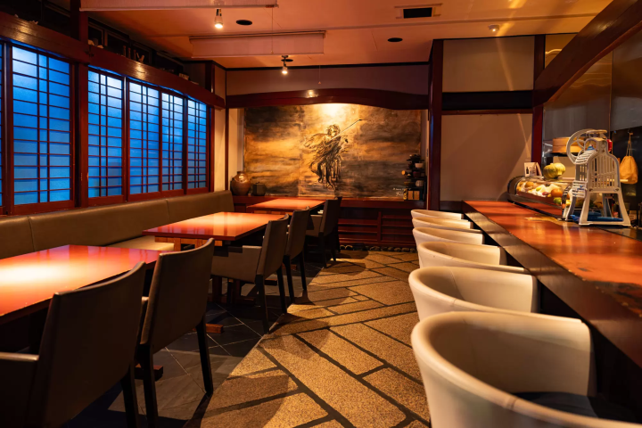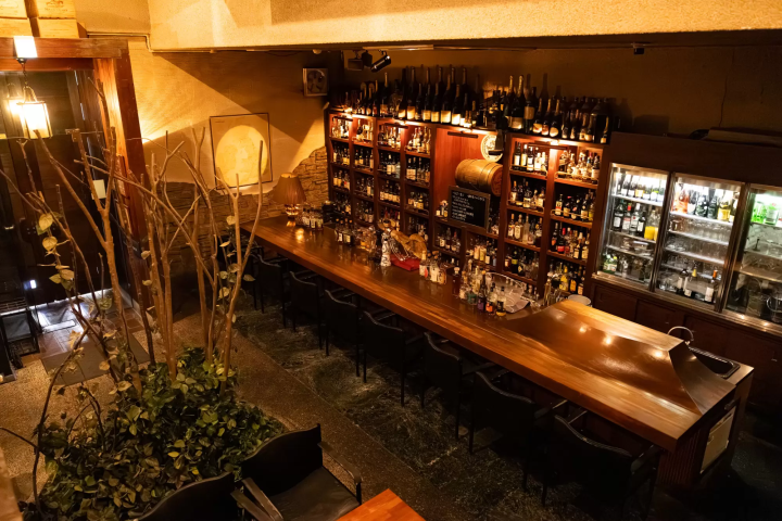ハレマチ通り沿いにあるこちらは、先代から続く重厚な雰囲気が漂う本格バー。木製カウンターのあるフロアは、桜の木をシンボルにした空間が広がり、40席ほどのゆとりある店内でくつろげます。