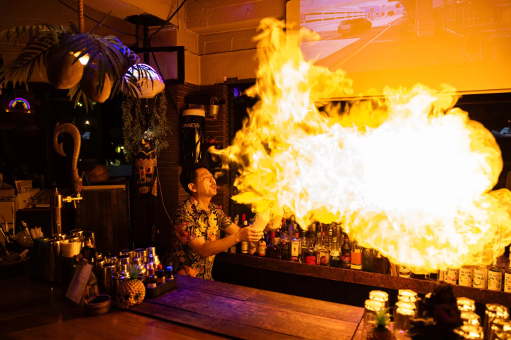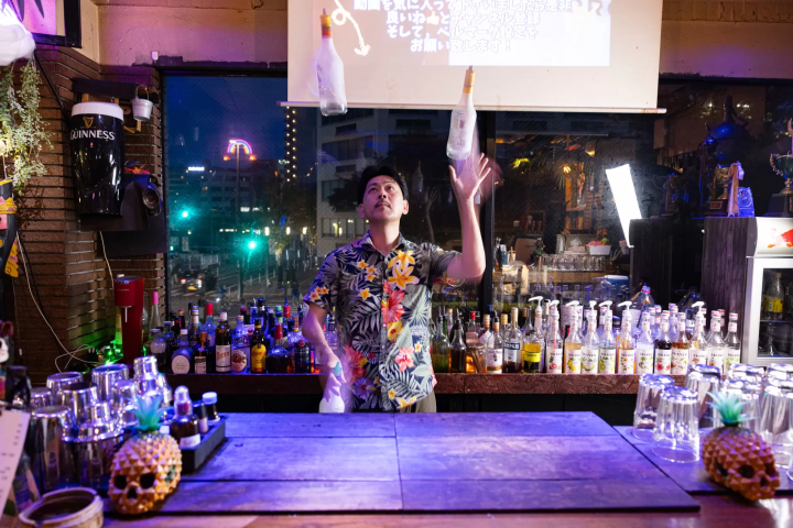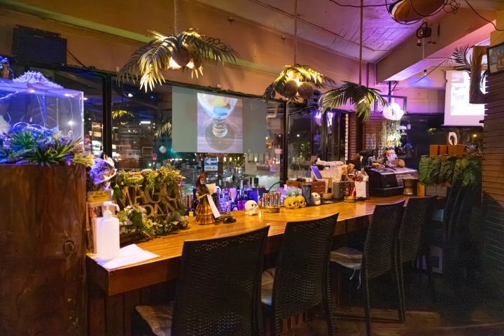 トロピカルカクテルやハワイアンフードも充実し、幅広い客層が集います。岡山で唯一、世界大会出場経験のあるフレアバーテンダーのパフォーマンスが見られる店です。