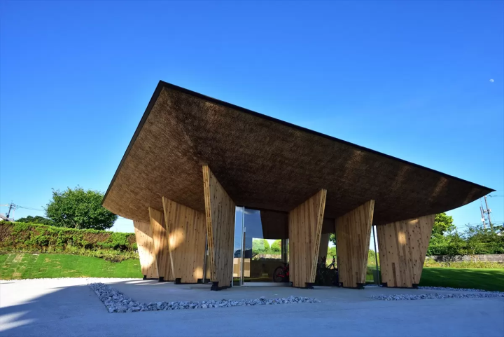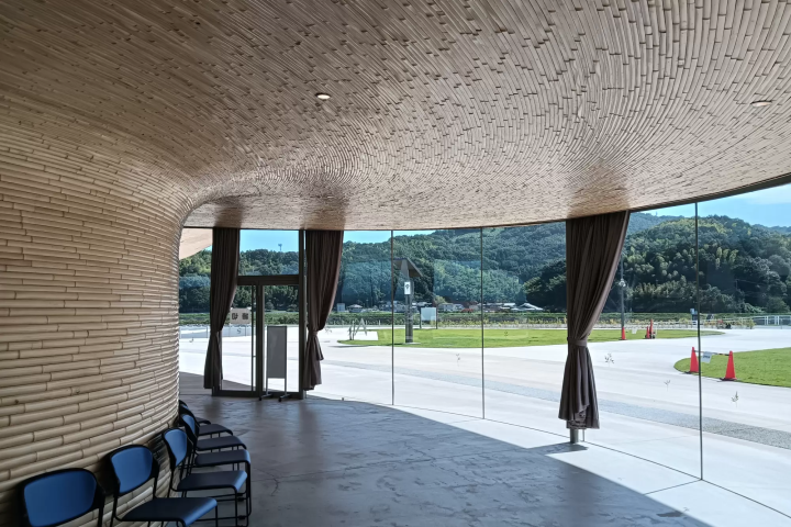 公園の中央にそびえ立つのは、竹で作られた印象的なゲートです。真備の山々と調和する大屋根と、地域の特産品である竹を使って造られました。ゲートの左右には、コミュニティ施設「まなびのへや」と防災備蓄倉庫が配置されています。地域の人々の想いと地元の素材を大切にした隈建築の精神が、ここにも表れています。