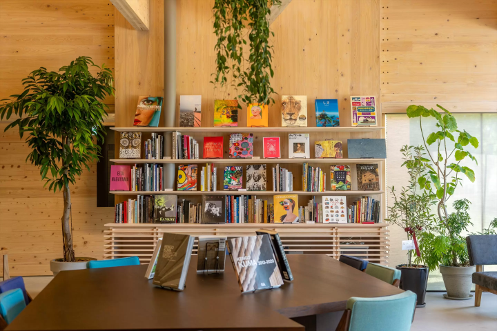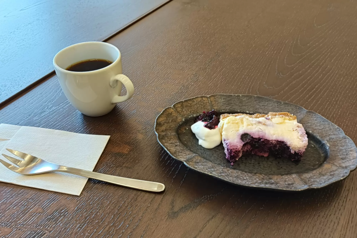 筆者が訪れたのは午後だったため、地元・吉備中央町産のブルーベリーを使ったNYチーズケーキとコーヒーのセット(990円)をいただきました。クリームチーズと生クリームの濃厚な味わいが絶品です。店内には隈研吾氏のサインや建築模型、書籍コーナーもあり、お気に入りの本を見つけてゆっくり過ごすのもおすすめです。
