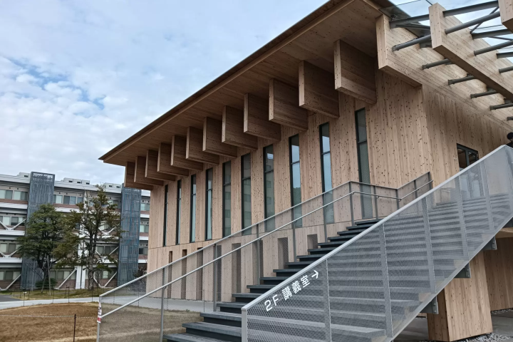 岡山大学津島キャンパス内にある「共育共創コモンズ」は、木造建築を学ぶ学生たちにとって実物大の教材となることを目指してデザインされた木の教室です。使用されている木材はCLT材。地元の素材にこだわる隈建築の理念が、ここでも一貫して表れています。