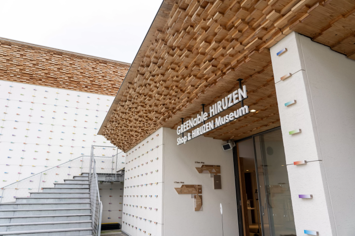 「GREENableHIRUZEN」は、広大な敷地全体が隈氏によって設計されています。敷地内には「風の葉」のほか、サイクルセンター(自転車レンタル施設)、観光案内所、ミュージアムなど、様々な建物が点在しています。