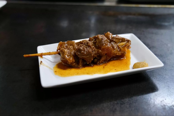 しげさんが案内してくれた、とっておきの場所をいくつかご紹介しましょう。まずは。ジュージューと焼ける牛すじの音と香りに誘われて、ふらりと店内へ。いつの間にかお店の方とすっかり打ち解けて、オーナー夫妻がまるで昔からの友人のように、洲本の昔話をたくさん聞かせてくれました。