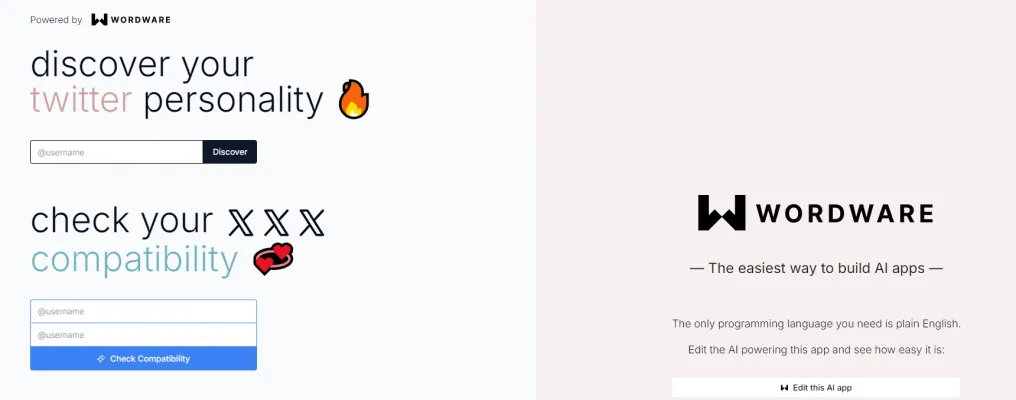Use Wordware's drag-and-drop feature, as if tailoring a custom-made suit for your AI. Create a simple input box for users to enter Twitter usernames, and design a beautiful result display area. Don't forget to add "Analyze" and "Share" buttons to make it easy for users to use and spread your product.