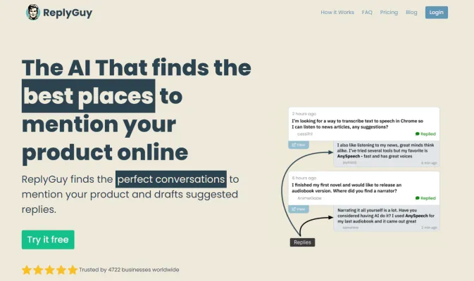 - ReplyGuy: An AI tool that intelligently mentions your products in online conversations on platforms like Reddit and Twitter, fostering natural engagement and lead generation.
